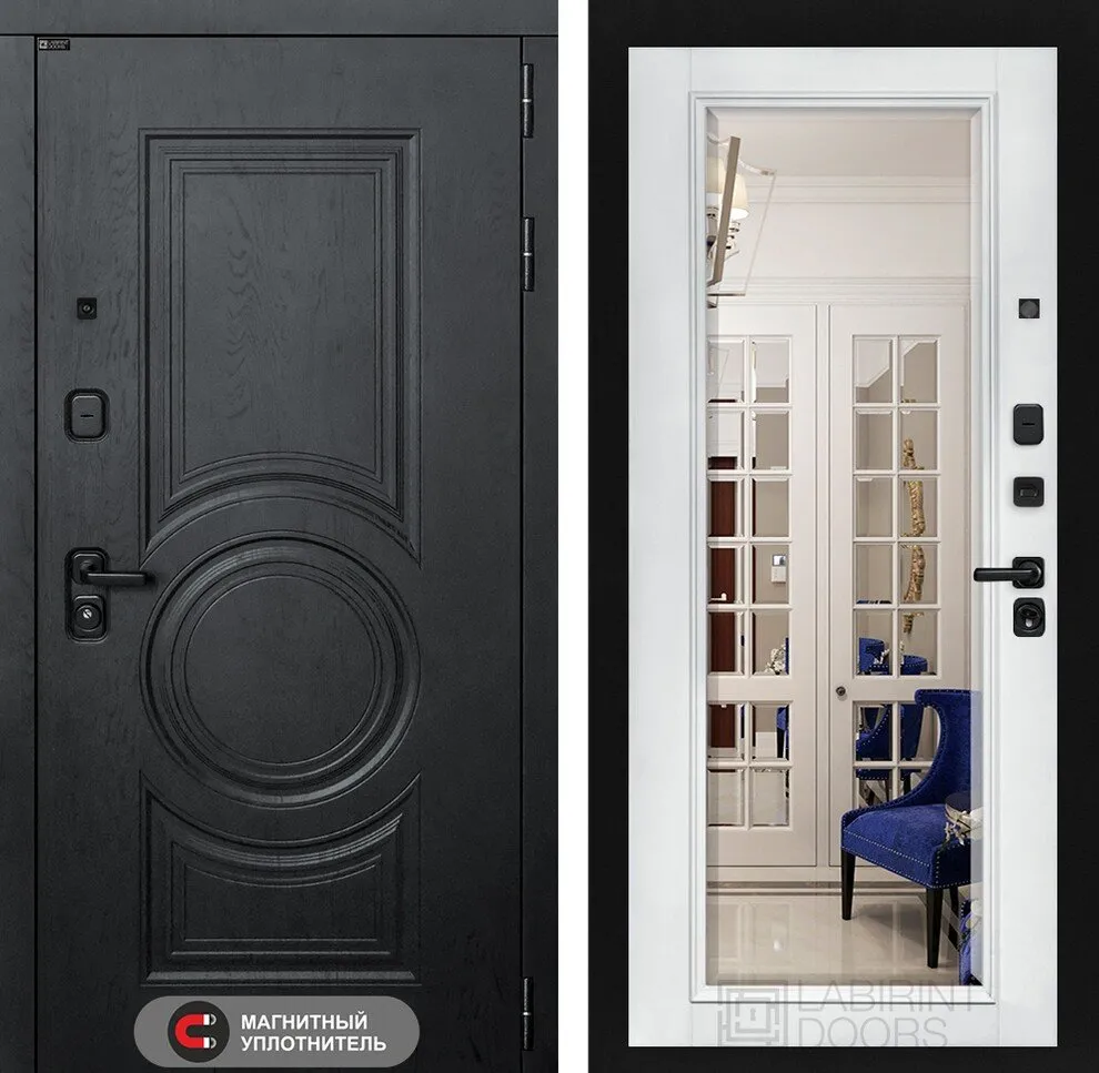 Фурнитура в черном цвете: Броненакладка врезная, накладка со шторкой, глазок , дверная ручка, ночная задвижка. Цилиндр ключ-вертушка Apecs, регулируемый эксцентрик.